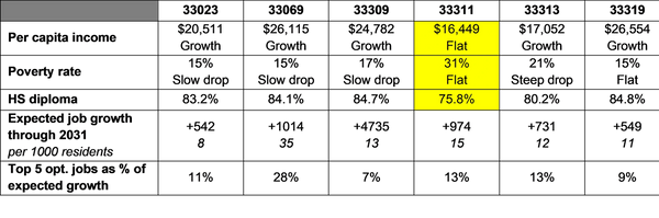 When utilizing the variables identified by the Data Working Group, data showed that from the six (6) Prosperity Zip Codes, 33311 had the highest need and opportunity to make a positive and lasting impact.